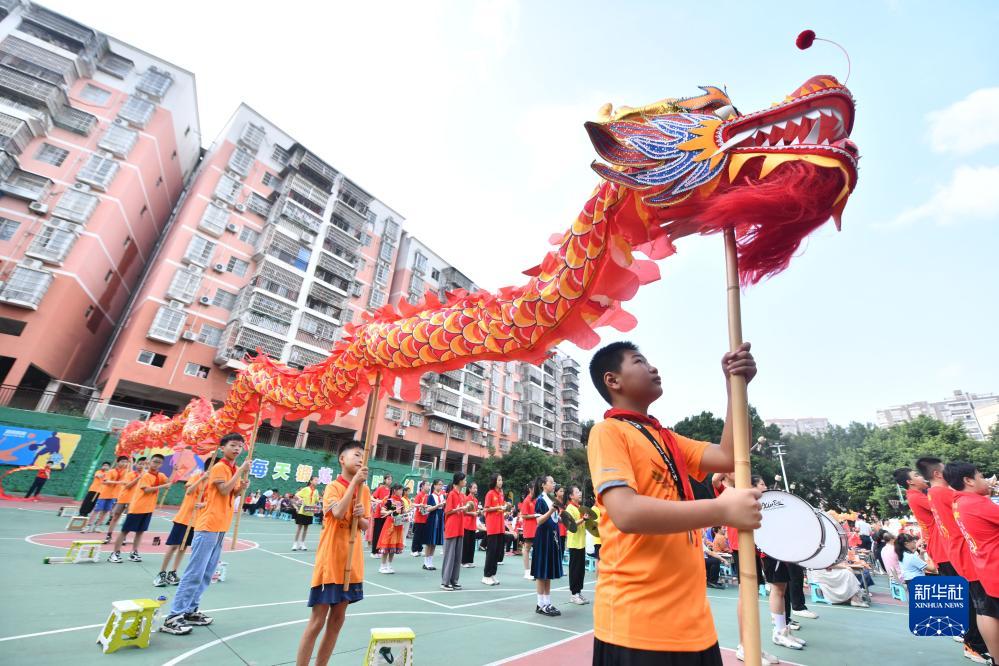 9月28日,在梧州市龍圩區龍圩中心小學,小學生們在舞龍。