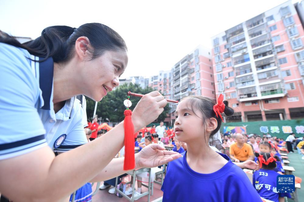 9月28日,梧州市龍圩區龍圩中心小學老師為一年級新生點硃砂啟智。