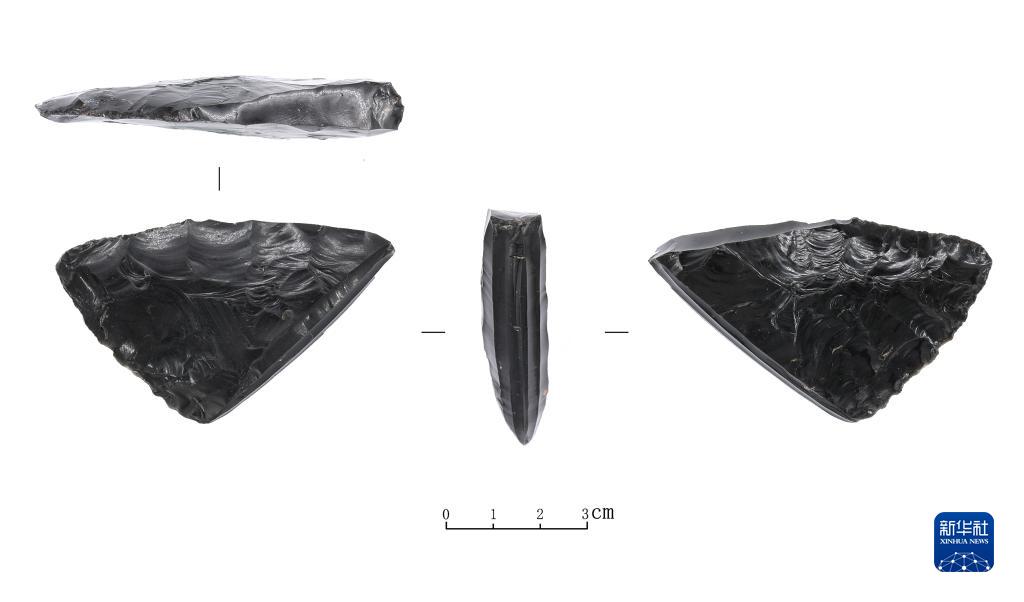 圖為和龍大洞遺址出土的細石葉石核。吉林和龍大洞遺址年代距今5—1.5萬年,是中國長白山地區年代最早、文化序列最完整的舊石器時代晚期遺址,也是目前東北亞最早利用黑曜岩製作石器的遺址之一,清晰地展示了該地區石器工業由石片石器向“石葉—細石葉”技術轉變的重要過程,豐富了東北亞現代人演化擴散、文化發展、生計方式的相關認識。