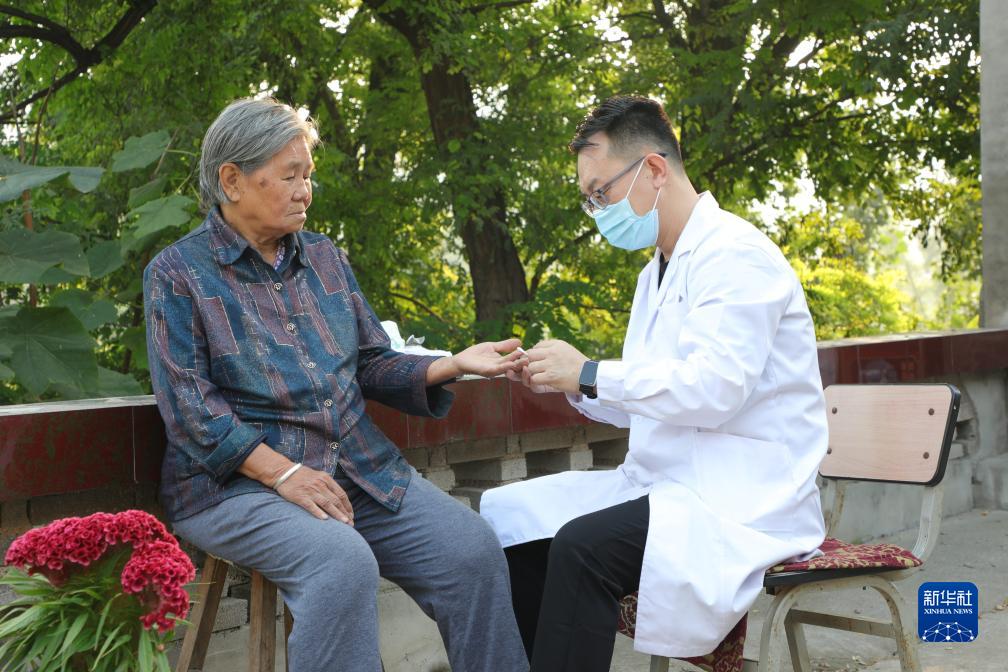 9月28日,保定市徐水區義聯莊鄉衞生院家庭醫生在崔莊村入戶為村民檢測血糖。
