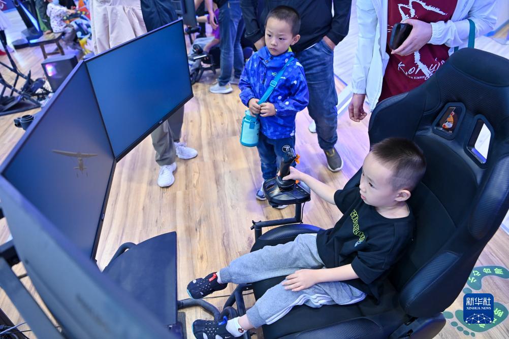 9月28日,小朋友在2023太原國際通用航空博覽會上體驗模擬飛行系統。