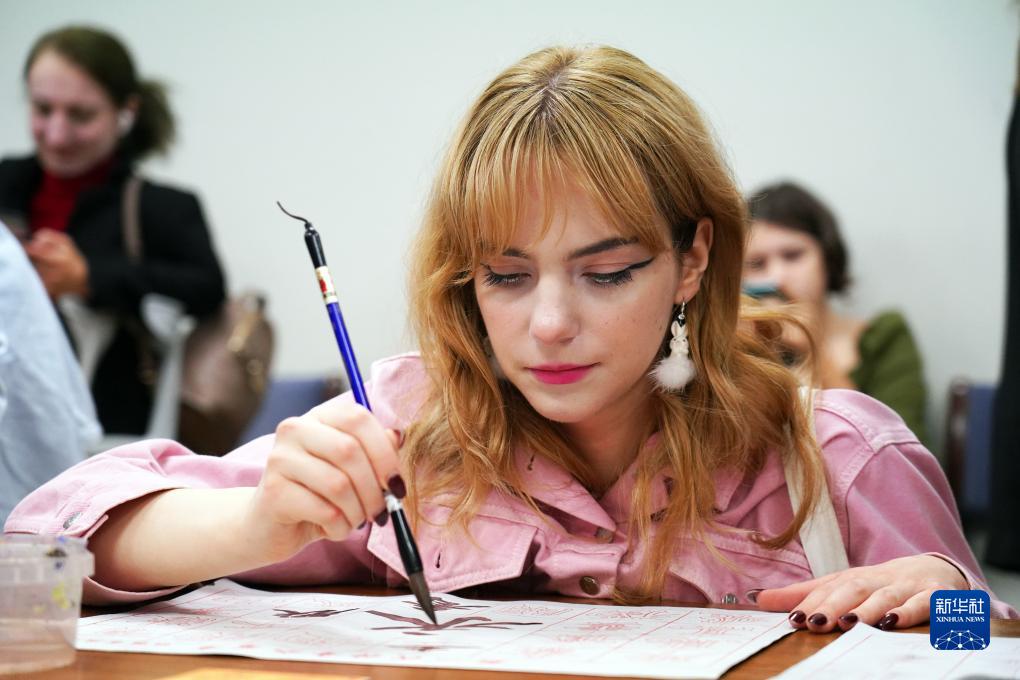 9月25日, 在拉脫維亞首都里加的拉脫維亞大學禮堂,一名拉脫維亞女青年在中國文化工作坊活動上學習中國書法。