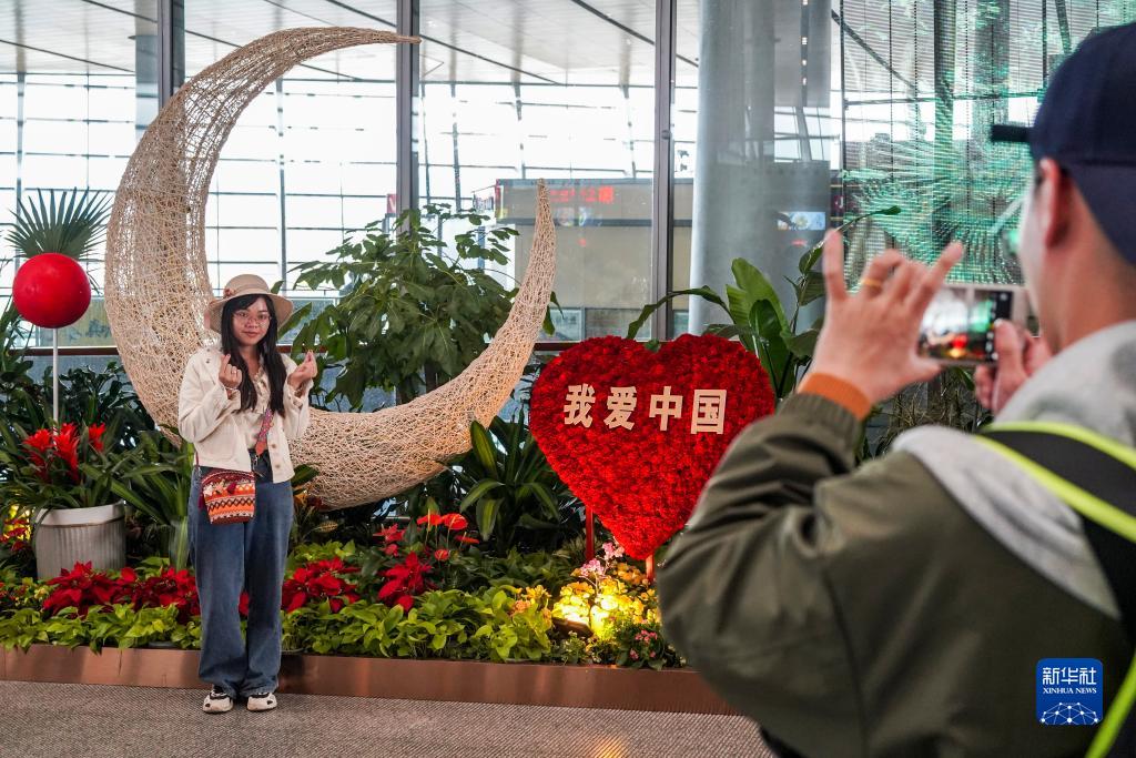 在昆明市長水機場,旅客在國慶花卉前拍照(9月27日攝)。