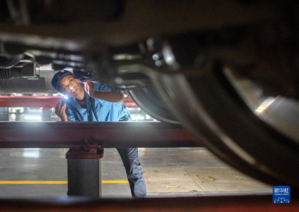 馬耀鋒在檢查動車組制動夾鉗的狀態(9月26日攝)。