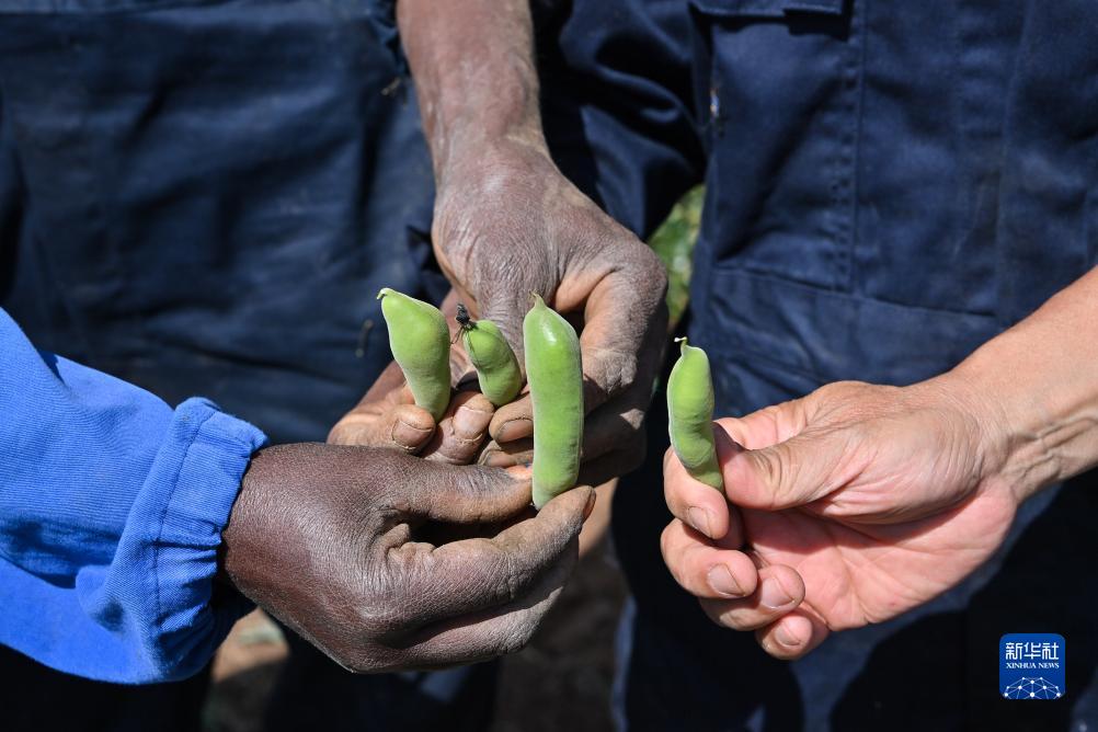 9月27日,在位於厄立特裏亞阿斯馬拉的農業技術援助項目示範地,中國援厄第三期高級農業專家組豆類作物專家劉運民(右一)與當地農戶比對蠶豆作物的生長狀態。