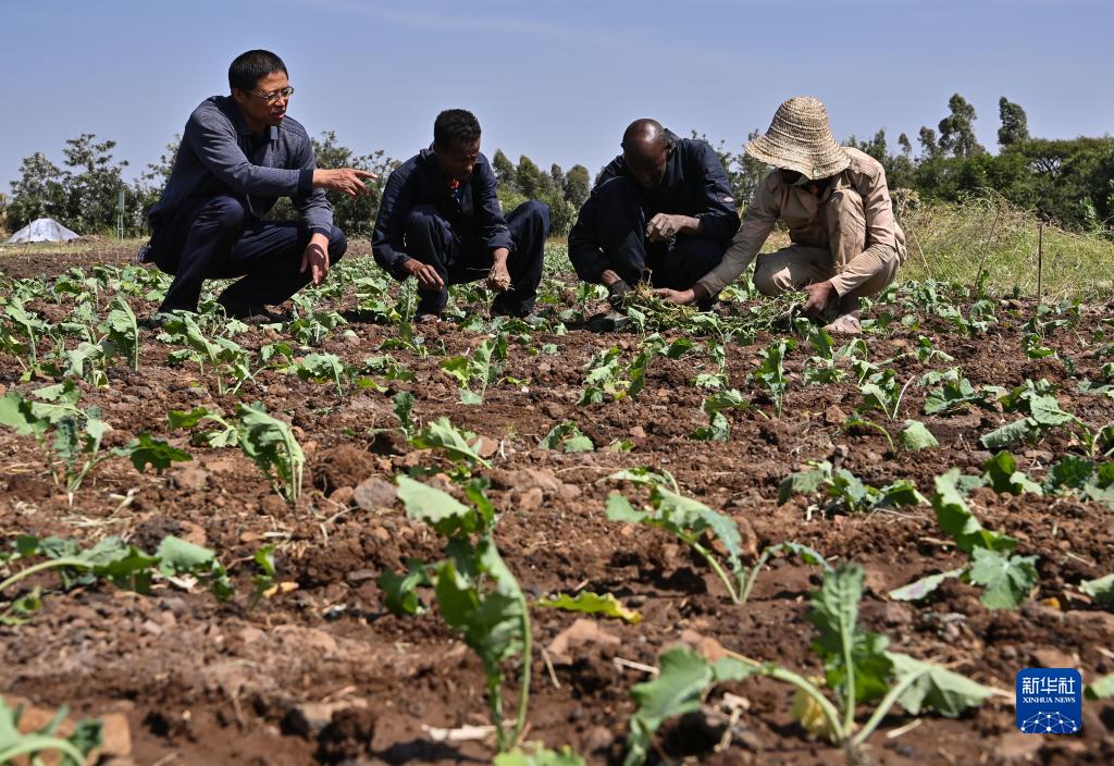 9月27日,在位於厄立特裏亞阿斯馬拉的農業技術援助項目示範地,中國援厄第三期高級農業專家組油料作物專家周成(左一)指導當地農戶種植油菜。