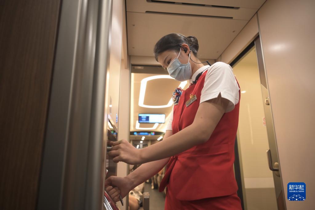 首發車G9801次列車長車艷雪和她的同事登上福廈高鐵復興號智能動車組為乘客服務。“在列車上我們要用心用情做好服務,讓乘坐福廈高鐵的乘客在旅行中享受到不一樣的跨海之旅,展現我們海上‘高姐’的風采。”車艷雪説。