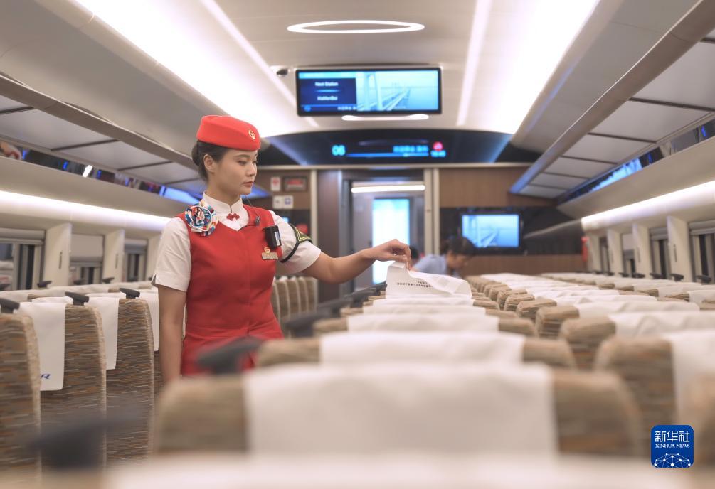 首發車G9801次列車長車艷雪和她的同事登上福廈高鐵復興號智能動車組為乘客服務。“在列車上我們要用心用情做好服務,讓乘坐福廈高鐵的乘客在旅行中享受到不一樣的跨海之旅,展現我們海上‘高姐’的風采。”車艷雪説。