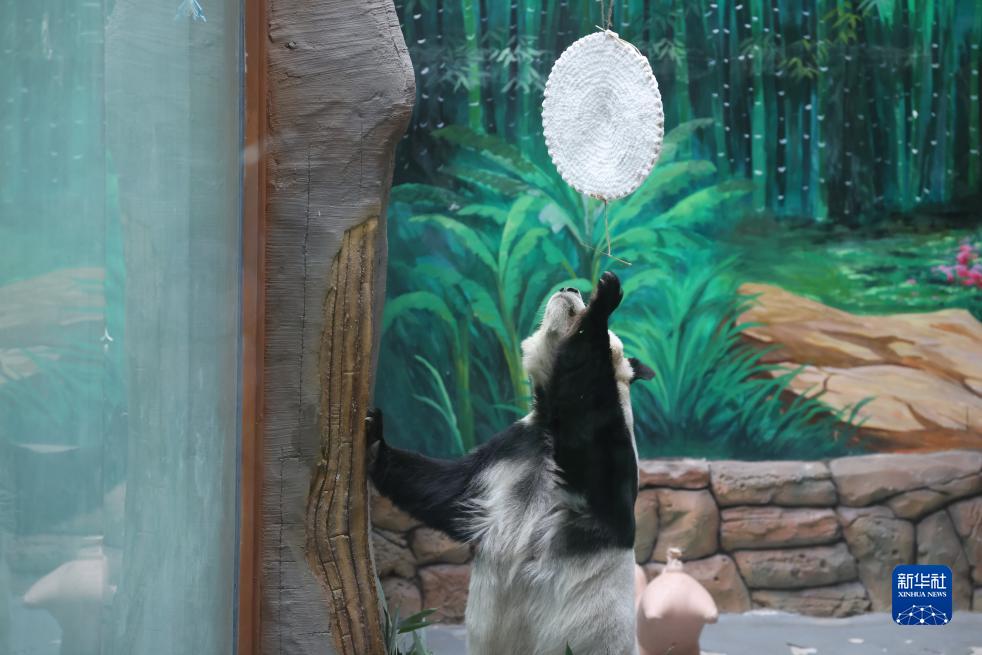 9月29日,西寧熊貓館的一隻大熊貓站立起來,試圖抓取館內裝飾的“圓月”。