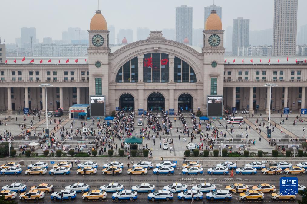 9月29日,旅客在漢口站排隊進站(無人機照片)。