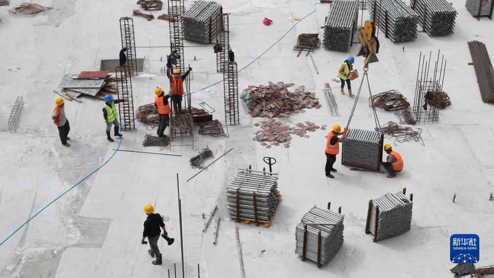 9月29日,在貴州省六盤水市安六高鐵六盤水站站前廣場建設施工現場,工人在起吊施工材料。