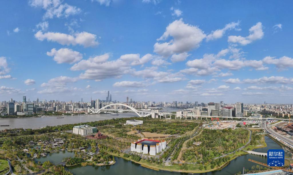 這是位於中國(上海)自由貿易試驗區世博片區的世博文化公園,右後為央企總部樓群(2022年10月17日攝,無人機照片)。
