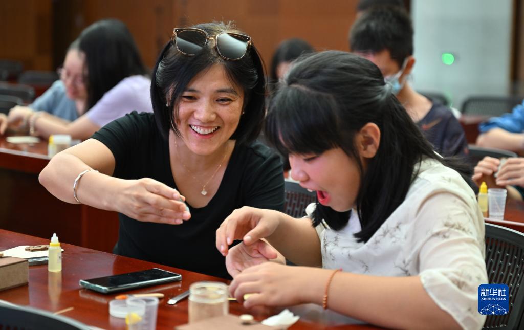 9月29日,家長帶着孩子在位於海南省海口市的海南省博物館參加古法制香牌活動。
