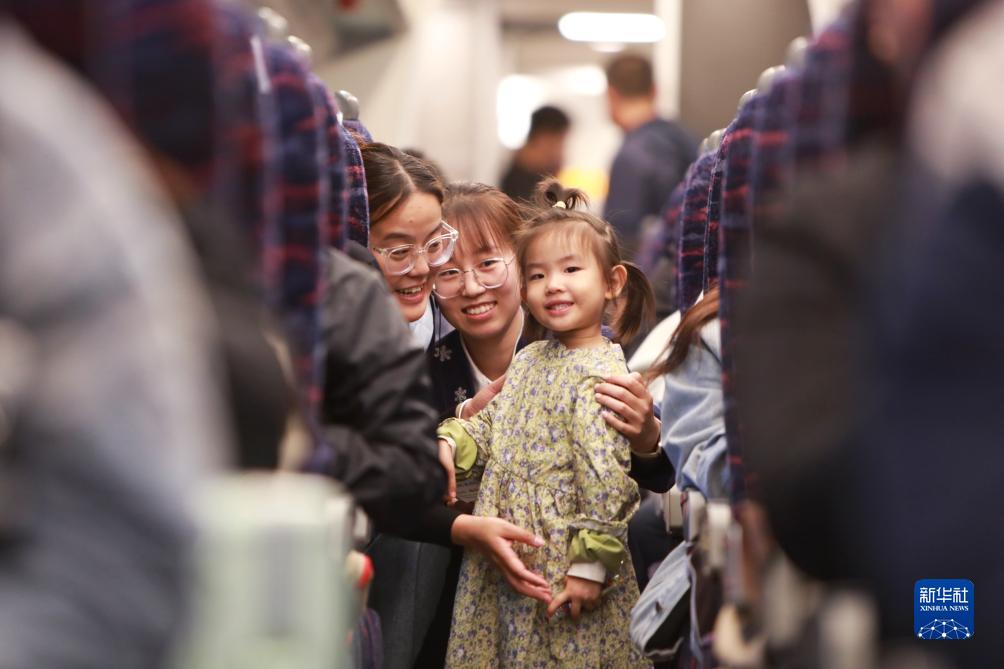 9月28日,乘務員在哈爾濱開往佳木斯的動車上為攜帶兒童的旅客提供服務。