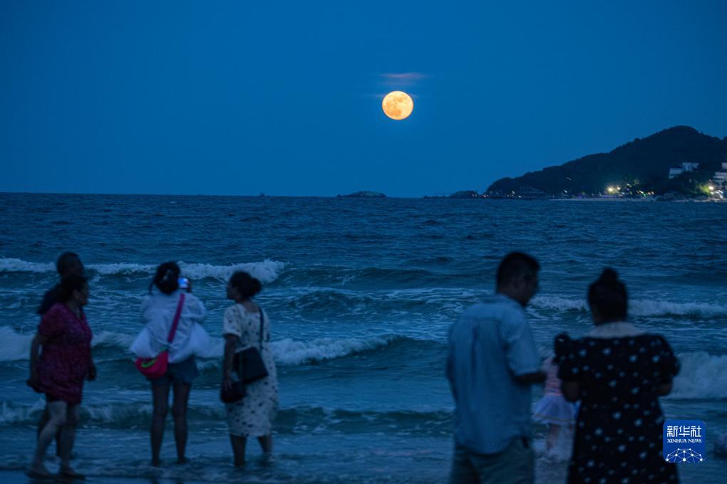 9月29日,人們在海南省三亞市海棠灣海邊賞月。