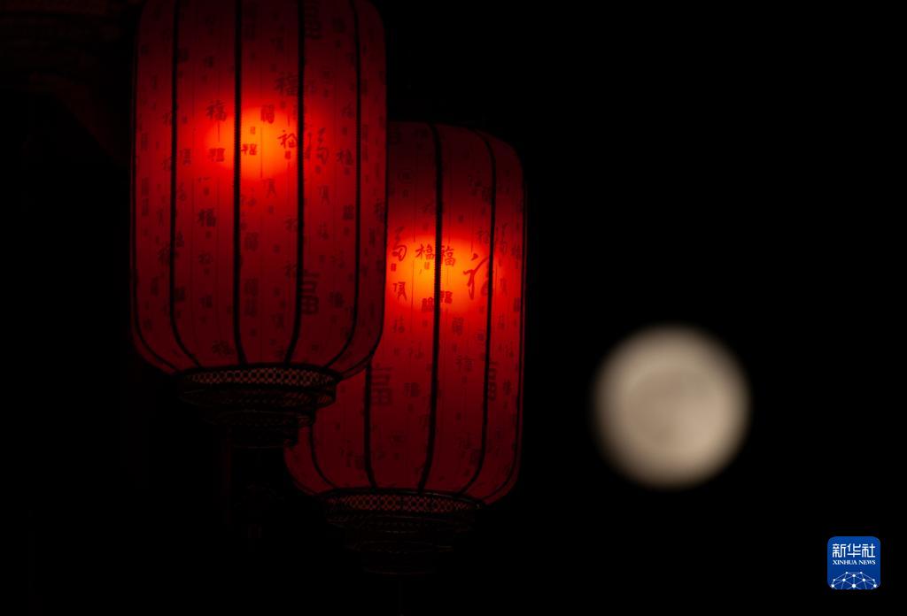 這是9月29日在貴州省黔東南苗族侗族自治州丹寨縣萬達小鎮拍攝的倣古燈籠和圓月。