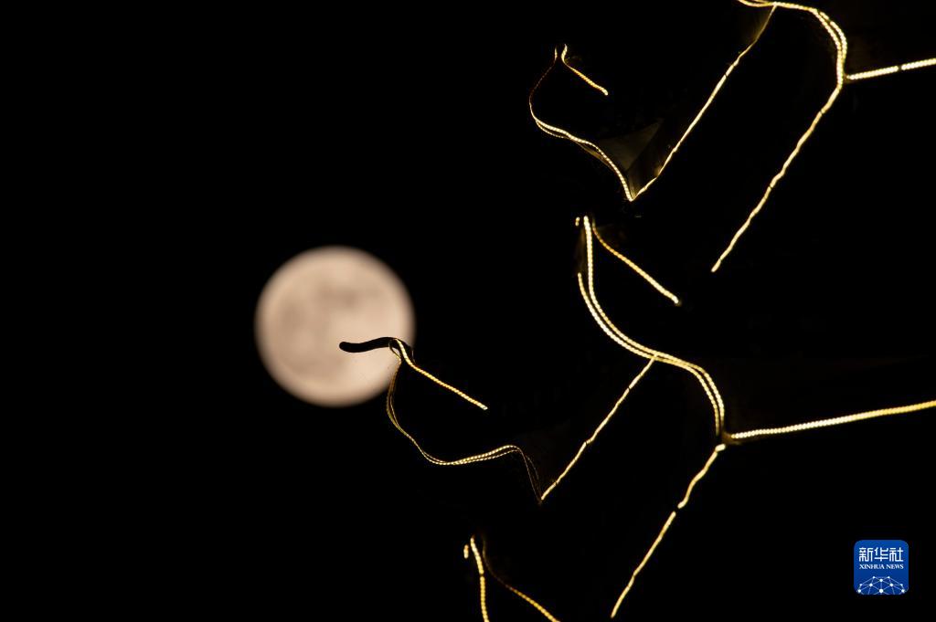 這是9月29日在貴州省黔東南苗族侗族自治州從江縣鼓樓生態廣場拍攝的月亮。