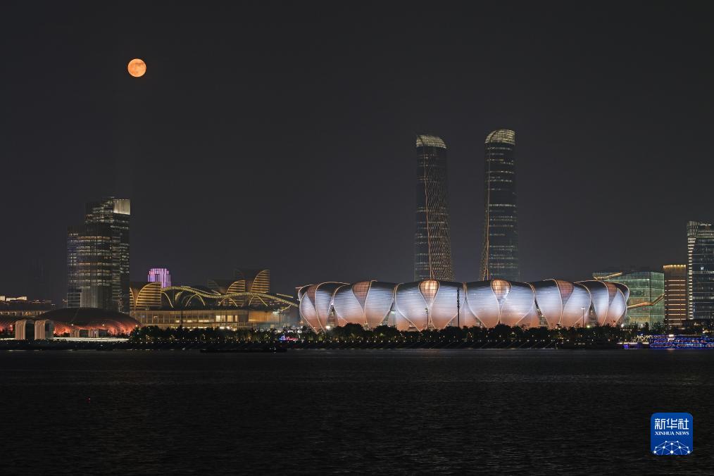 這是9月29日在杭州拍攝的杭州奧體中心體育場和滿月。