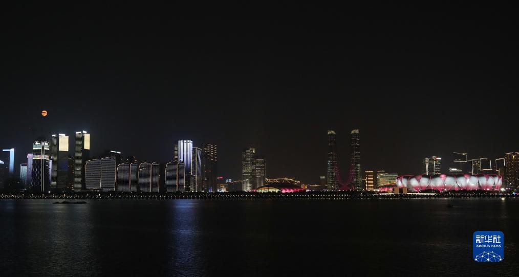 中秋佳節當晚,一輪滿月高懸在杭州上空,吸引眾多市民游客觀賞。