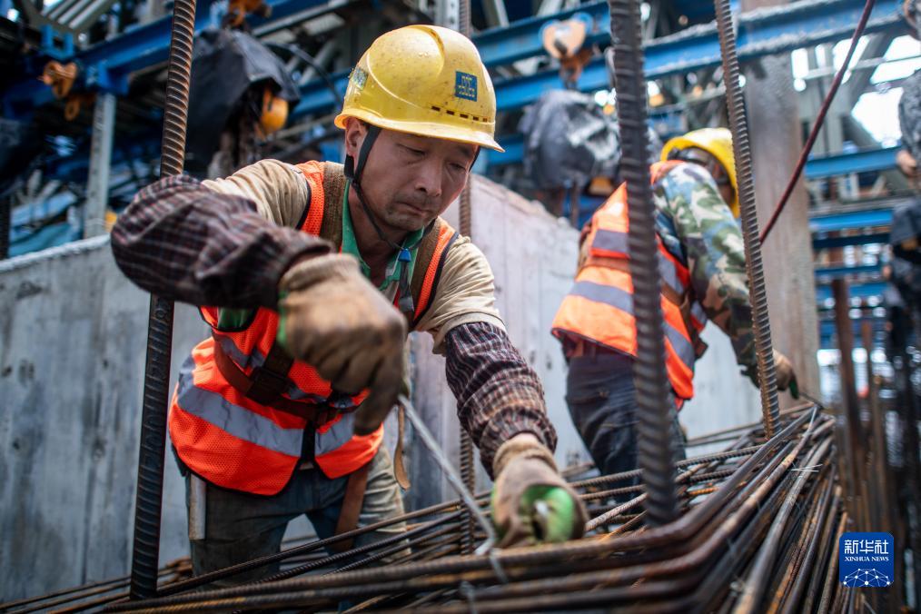 9月30日,在湖北省武漢長江中心項目工地,中建三局工人在空中造樓機內進行鋼筋綁扎作業。