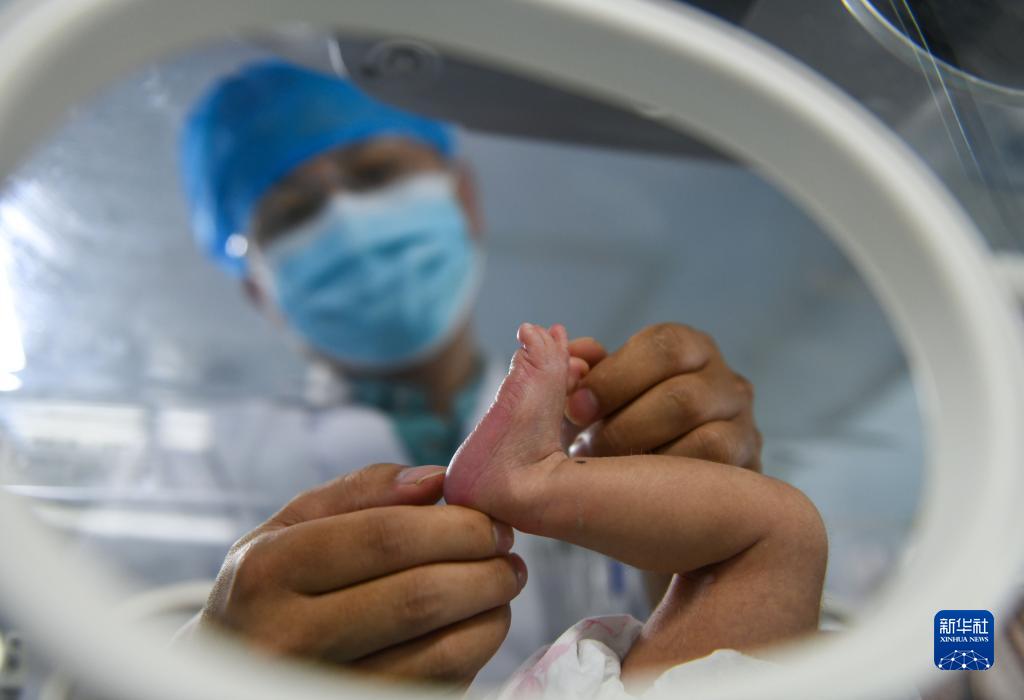 9月30日,在湖南省永州市道縣人民醫院新生兒科,醫務人員在給新生兒做護理。