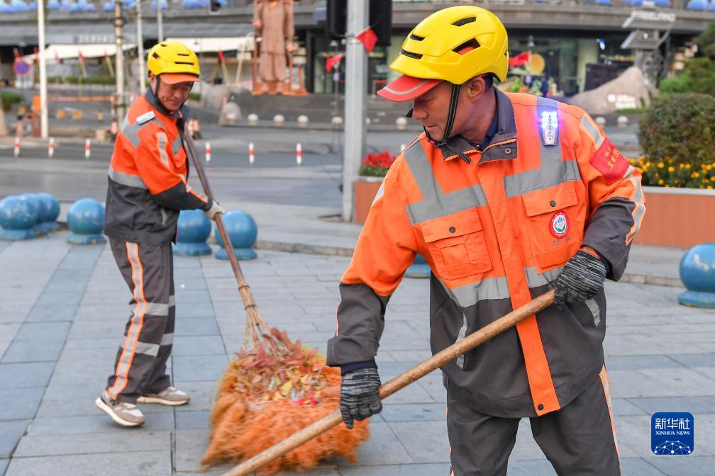 9月30日清晨,在吉林長春市朝陽區紅旗街與同德路交匯處,環衛工人畢永生(右)、廉士微在清掃人行步道。