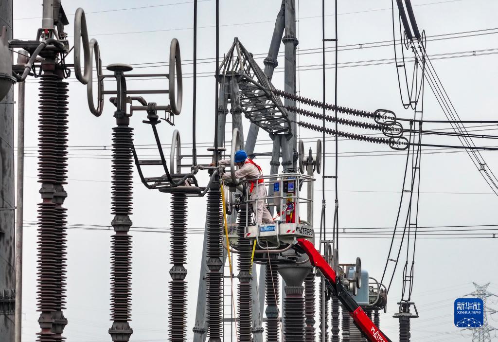 9月30日,電力人員在江蘇省泰州市500千伏泰興變電站檢修現場對設備進行檢修作業(無人機照片)。