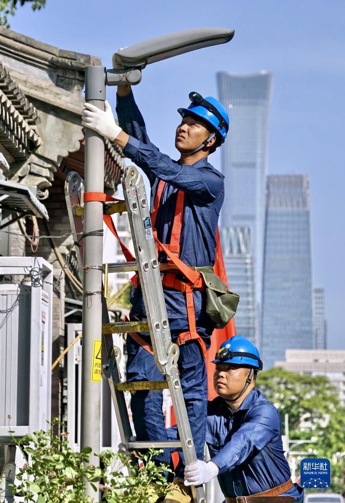 9月30日,北京市路燈照明管理中心的技術員在維修西總布胡同的故障路燈。