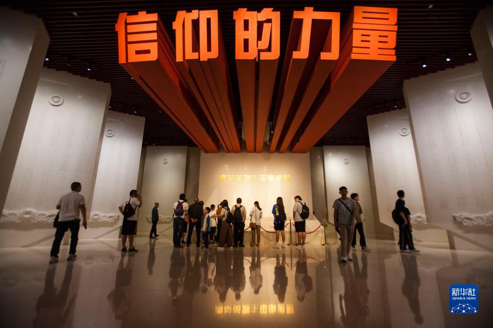 9月30日,游人在南京雨花&烈士陵園的烈士紀念館裏參觀。