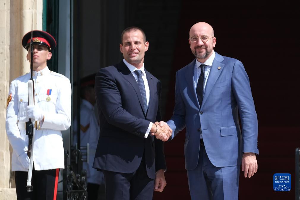 9月29日,在馬耳他瓦萊塔,馬耳他總理阿貝拉(前左)歡迎前來參會的歐洲理事會主席米歇爾(前右)。