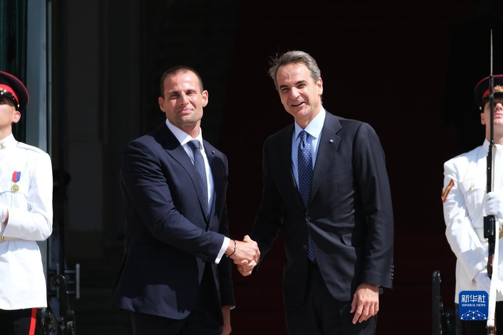 9月29日,在馬耳他瓦萊塔,馬耳他總理阿貝拉(前左)歡迎前來參會的希臘總理米佐塔基斯(前右)。