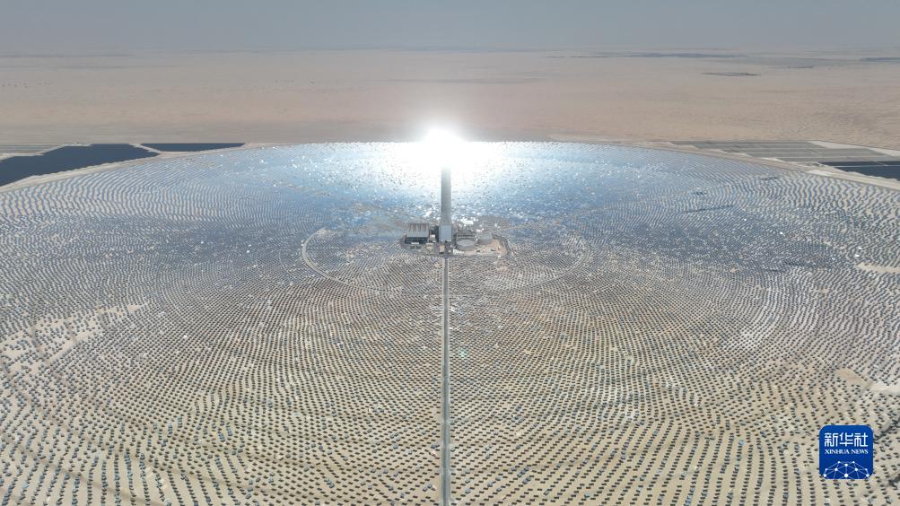 這是上海電氣迪拜光熱光伏複合項目(2023年7月25日攝,無人機照片)。