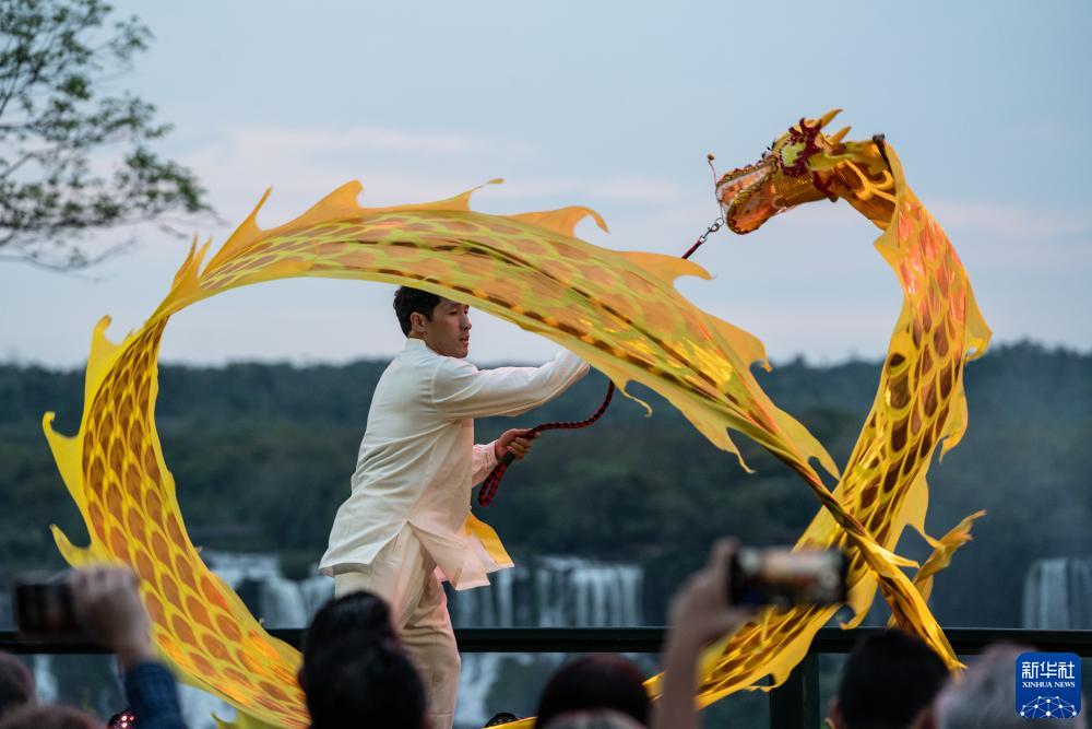 9月29日,演員在巴西伊瓜蘇舉行的中秋晚會上進行舞龍表演。