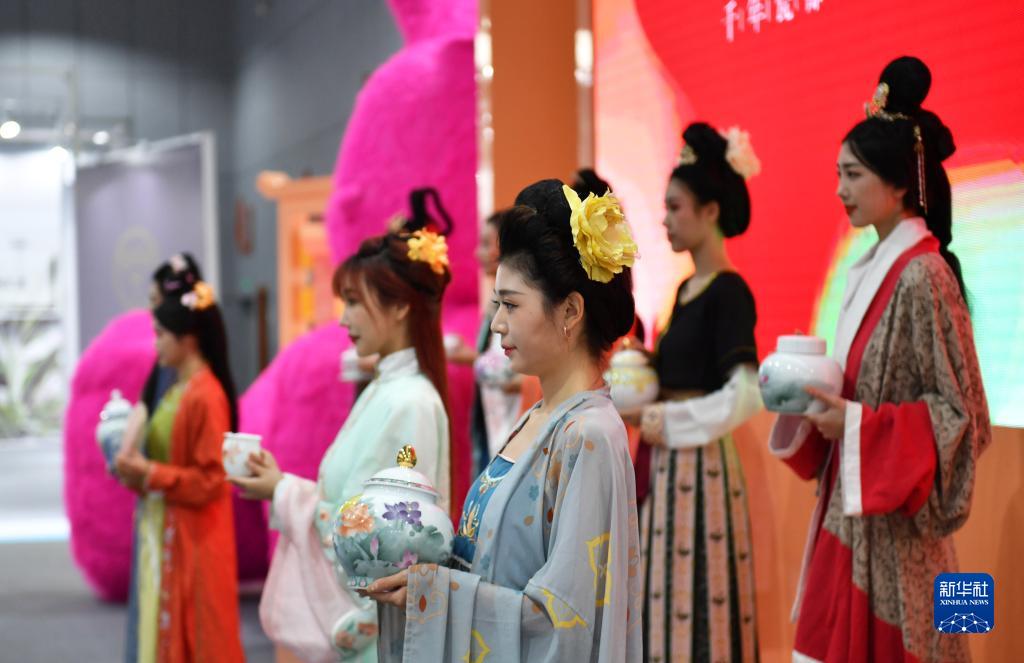 9月28日,在2023湖南(醴陵)國際陶瓷産業博覽會上,漢服愛好者在展示陶瓷。
