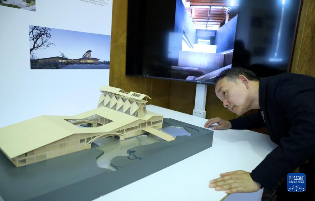 9月29日,在英國倫敦,中國工程院院士、東南大學教授王建國在“建築當代中國”展覽上觀看自己的作品模型。