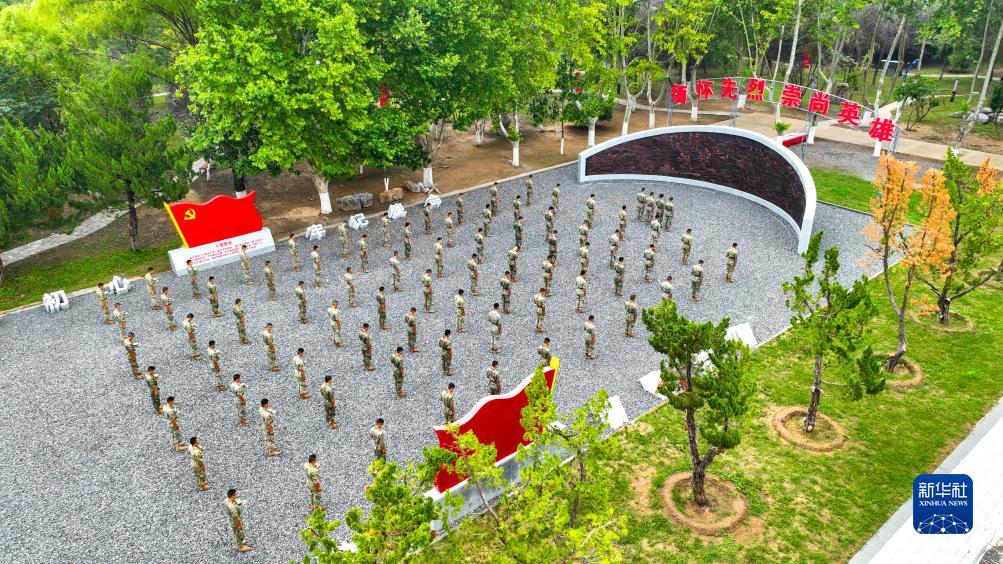陸軍第71集團軍“攻堅勁旅”組織官兵在該旅緬懷先烈廣場舉行紀念儀式,向犧牲的烈士和戰鬥英雄們默哀(無人機照片,9月28日攝)。