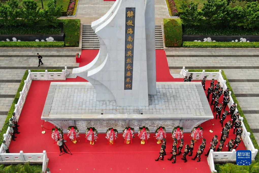 9月30日,武警海南總隊海口支隊官兵在解放海南島戰役烈士陵園瞻仰烈士紀念碑(無人機照片)。