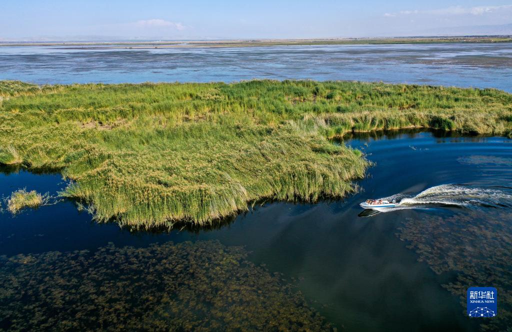 9月15日,在烏梁素海湖面上,武蓉、馮琛和劉瑩慧乘坐快艇去採集湖水樣本(無人機照片)。