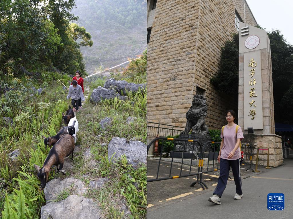 這是一張拼版照片,左圖為:在廣西都安瑤族自治縣拉烈鎮崇業村弄後屯,藍曉萍(後)和妹妹藍雲萍放學回家後放羊(2015年4月14日攝);右圖為:在廣西南寧師範大學,藍曉萍放學後走出校門(2023年9月26日攝)。