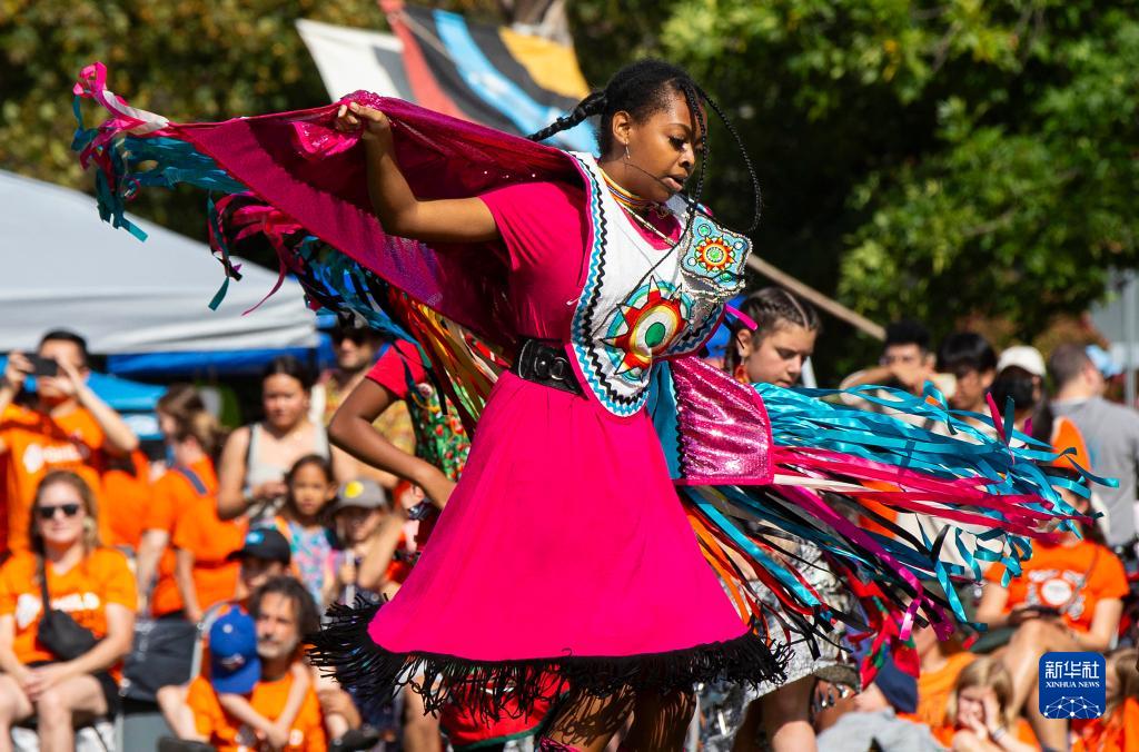 9月30日,身着原住民服飾的兒童在加拿大多倫多舉辦的“全國真相與和解日”紀念活動中表演舞蹈。