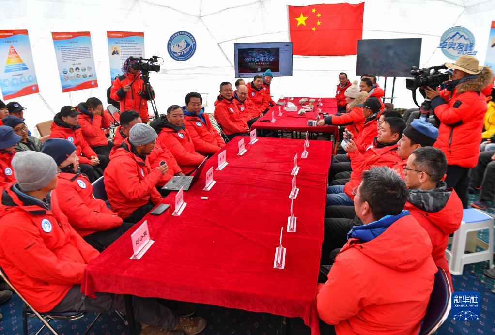 在海拔約4950米的卓奧友峰科考指揮大本營裏,科考隊員趙華標(手拿麥克風者)在宣讀剛剛接收到的頂峰氣象觀測數據。這標誌着峰頂自動氣象站架設成功,成功傳回觀測數據(10月1日攝)。