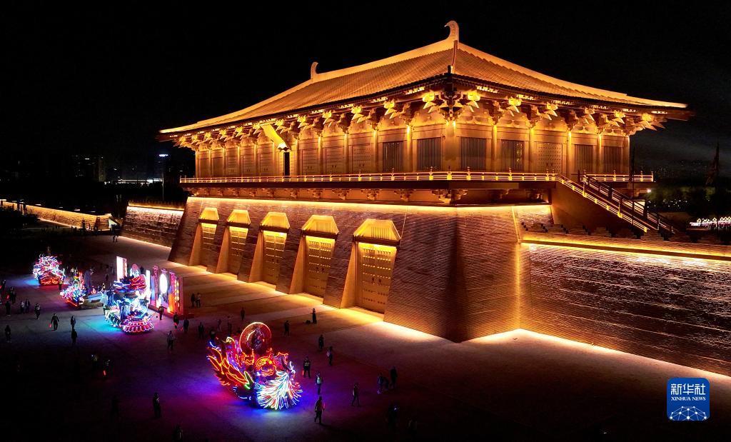 巡游彩車從西安大明宮國家遺址公園丹鳳門前駛過(9月30日攝,無人機照片)。