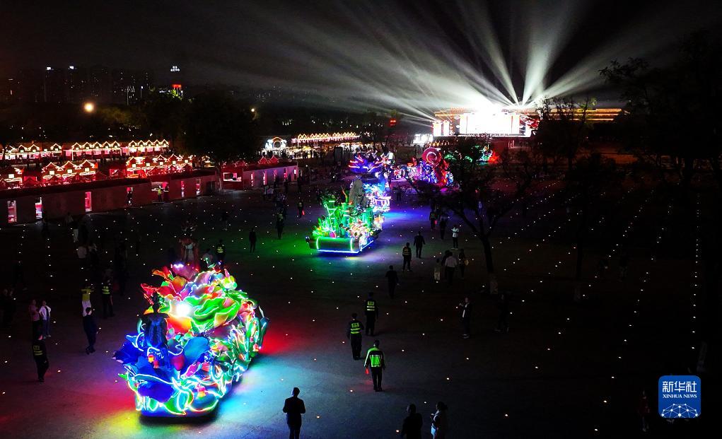 巡游彩車在西安大明宮國家遺址公園禦道廣場行駛(9月30日攝,無人機照片)。