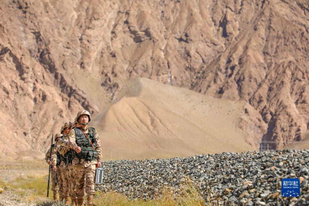 10月1日,武警青海總隊海西支隊官兵在青藏鐵路沿線武裝巡邏。