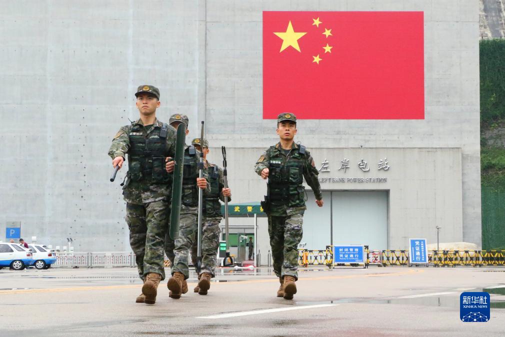 10月1日,武警湖北總隊宜昌支隊官兵在三峽大壩警戒巡邏。