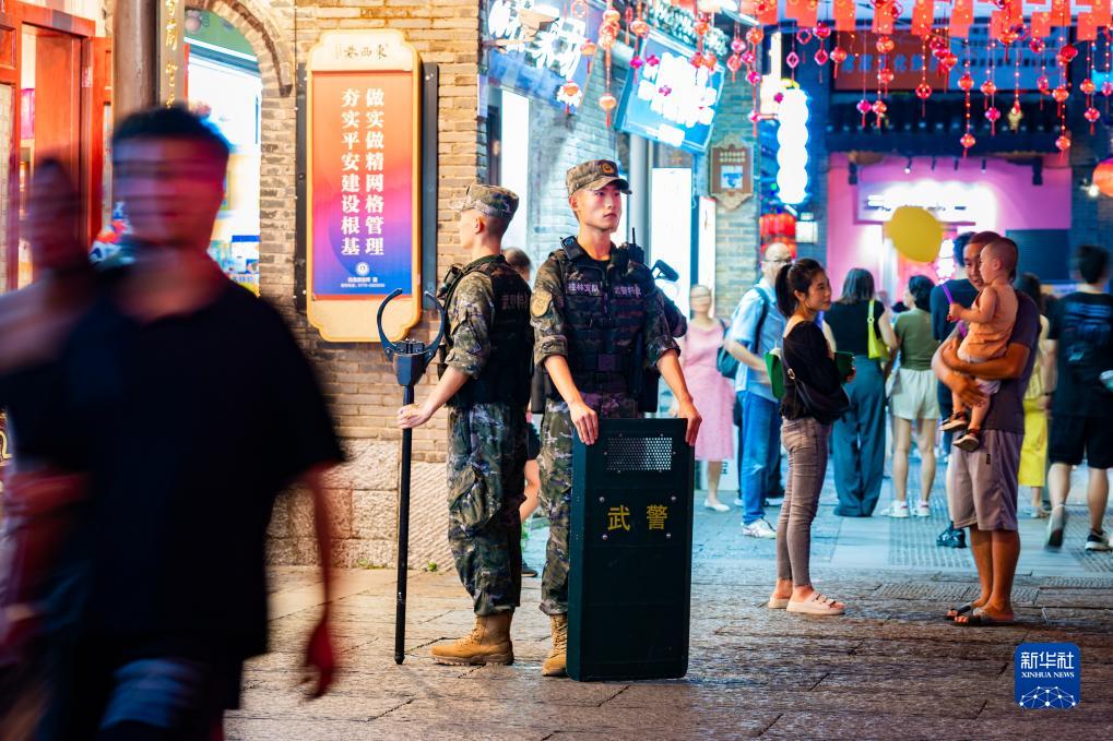 武警廣西總隊桂林支隊官兵在桂林市東西巷商業區執勤(9月29日攝)。