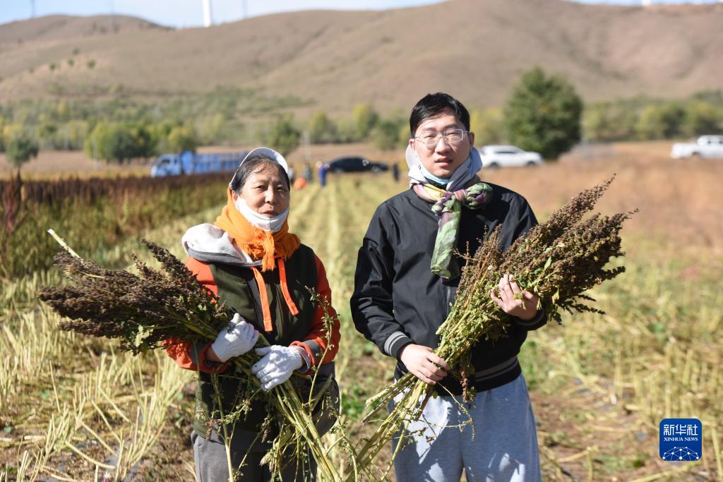 10月1日,在沽源縣白土窯鄉小西溝村,當地種植戶王秀梅和她的兒子趙擎宇抱着收穫的紅藜麥合影。
