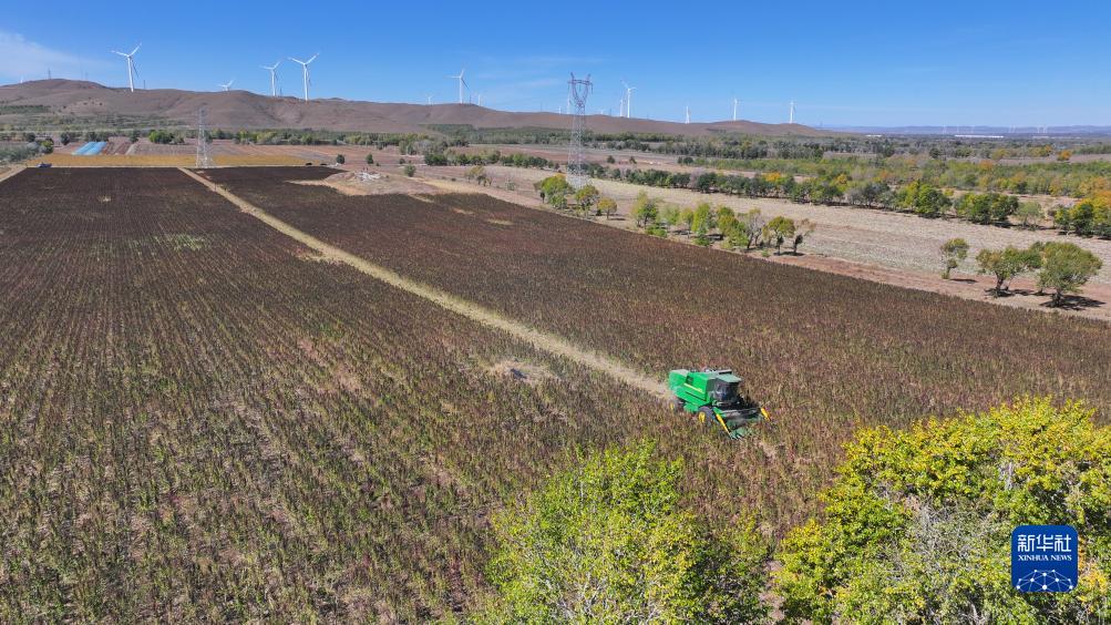 10月1日,在沽源縣白土窯鄉小西溝村,當地農機手正在田間操作收割機收穫藜麥(無人機照片)。