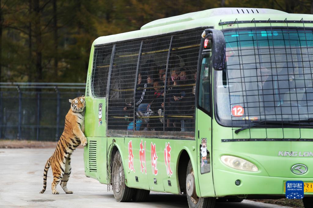 10月1日,在橫道河子東北虎林園東北虎散放區,一隻東北虎“親近”觀賞車。