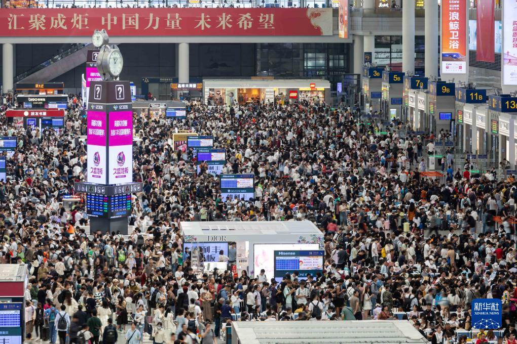 10月1日,上海虹橋火車站候車大廳裏人頭攢動。
